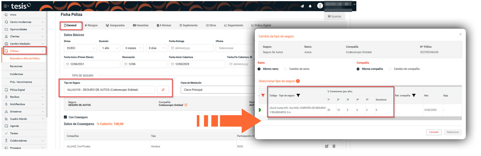 Al cambiar el tipo de seguro en una póliza, se añade el detalle del porcentaje de comisión esperada de cada producto a nivel informativo.