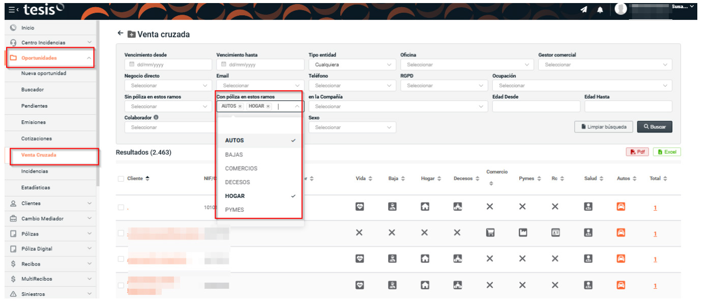 En el apartado de Venta Cruzada de Oportunidades, se habilita la posibilidad de buscar clientes con más de un ramo contratado, a través del filtro “Con póliza en el ramo”. Se permite así localizar clientes que tengan al menos una póliza en alguno de los ramos seleccionados.