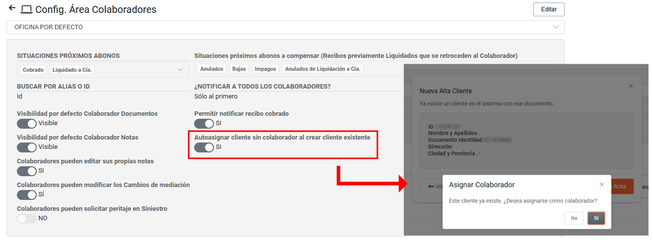 Se ha añadido un nuevo parámetro para la auto asignación de Clientes en la configuración de Área de Colaboradores. Al insertar el DNI del cliente podrá marcar “SI” en la opción «Autoasignar cliente sin colaborador al crear cliente existente» siempre y cuando no esté asignado a otro colaborador.