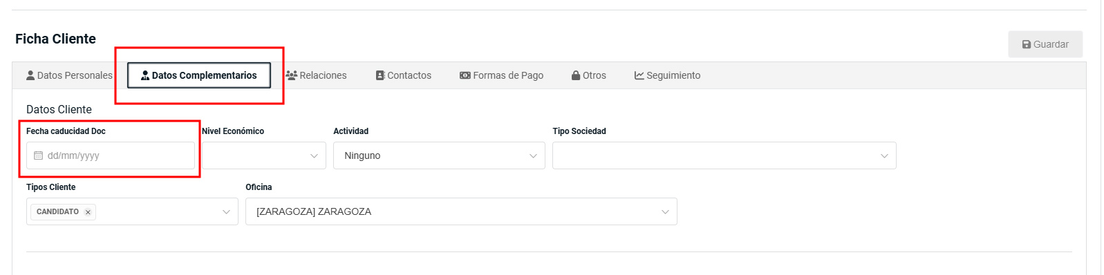 Se ha añadido el campo de fecha caducidad del documenta de identidad, en la ficha del cliente dentro de «Datos complementarios» como dato informativo. Interesante sobre todo en pólizas de Vida y Salud.